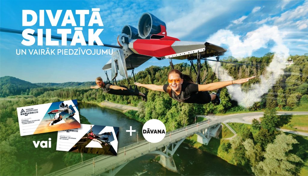 Visu februāri ir īstais brīdis uzdāvināt īstas emocijas. Iegādājoties Sigulda Adventures dāvanu karti tandēma piedzīvojumam – lēcienam ar gumiju vai lidojumam ar Zērgli vai Turbo Zērgli –, Tu saņem vairāk nekā tikai vienu neaizmirstamu pieredzi. Izdarot pirkumu akcijas laikā, dāvanā saņemsi 30 EUR bonusa dāvanu karti, ko varēsi izmantot Smart Bike vai River Adventures piedzīvojumiem visas 2026. gada sezonas garumā.